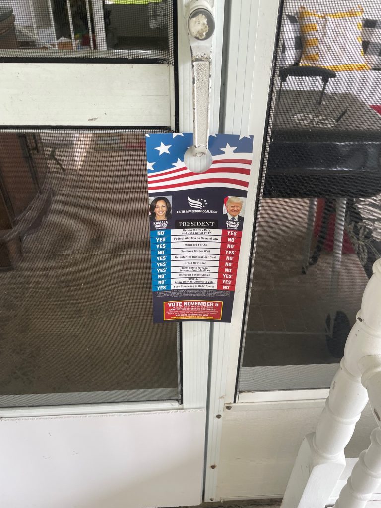 Rolling Greens Village (RGV) management has banned all dissemination of political materials. If you receive this door hanger or other political materials, please save the information and call the RGV office to advise.
